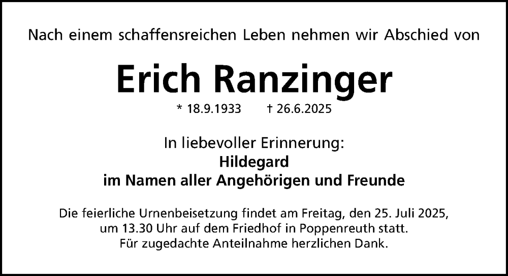 Hier finden Sie alle Traueranzeigen aus der Zeitung, die bisher für Erich Ranzinger erschienen sind. Weitere Traueranzeigen, die in der Zeitung erscheinen, werden hier ebenfalls aufgelistet