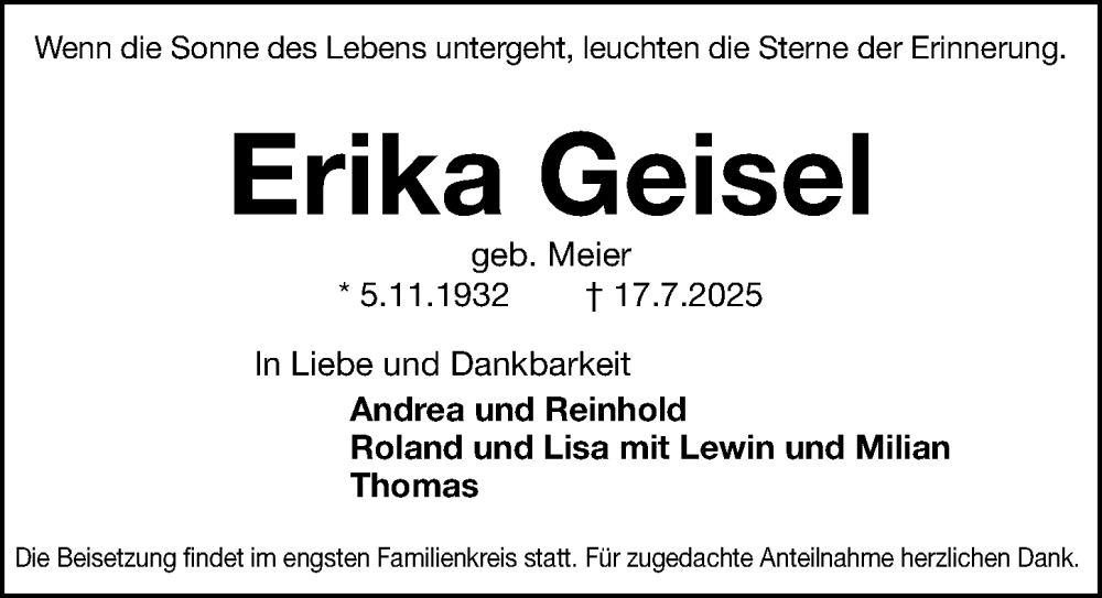 Hier finden Sie alle Traueranzeigen aus der Zeitung, die bisher für Erika Geisel erschienen sind. Weitere Traueranzeigen, die in der Zeitung erscheinen, werden hier ebenfalls aufgelistet