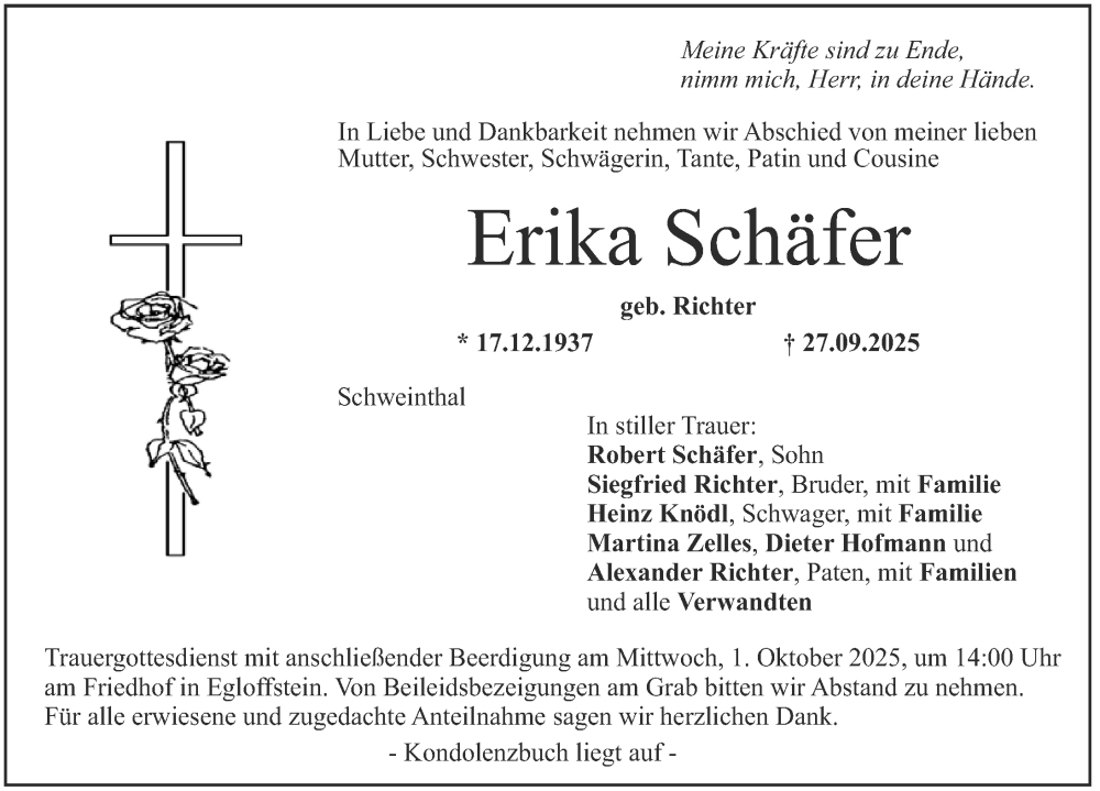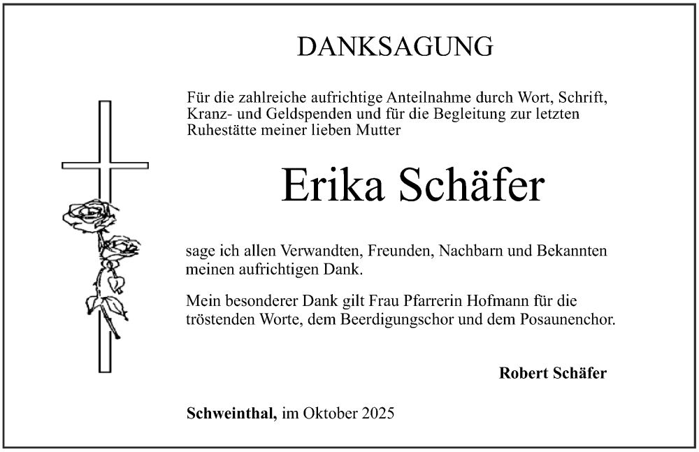 Hier finden Sie alle Traueranzeigen aus der Zeitung, die bisher für Erika Schäfer erschienen sind. Weitere Traueranzeigen, die in der Zeitung erscheinen, werden hier ebenfalls aufgelistet