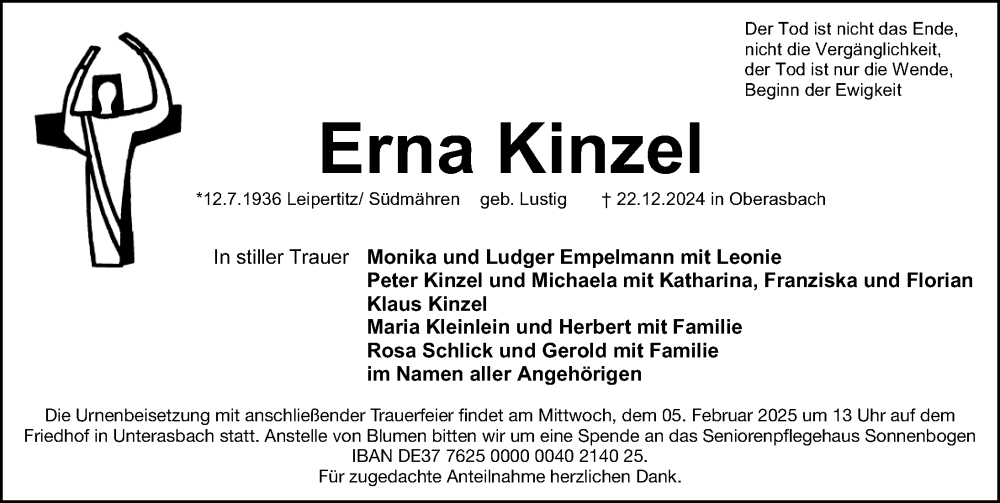 Hier finden Sie alle Traueranzeigen aus der Zeitung, die bisher für Erna Kinzel erschienen sind. Weitere Traueranzeigen, die in der Zeitung erscheinen, werden hier ebenfalls aufgelistet