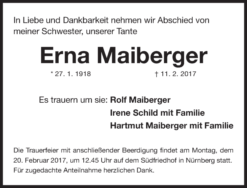 Hier finden Sie alle Traueranzeigen aus der Zeitung, die bisher für Erna Maiberger erschienen sind. Weitere Traueranzeigen, die in der Zeitung erscheinen, werden hier ebenfalls aufgelistet
