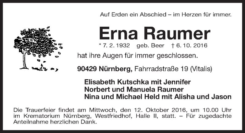 Hier finden Sie alle Traueranzeigen aus der Zeitung, die bisher für Erna Raumer erschienen sind. Weitere Traueranzeigen, die in der Zeitung erscheinen, werden hier ebenfalls aufgelistet