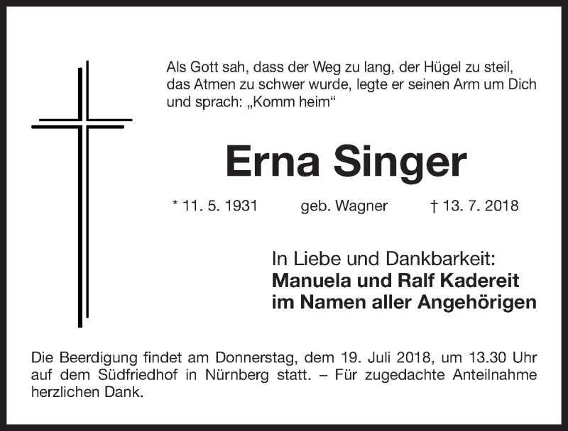 Hier finden Sie alle Traueranzeigen aus der Zeitung, die bisher für Erna Singer erschienen sind. Weitere Traueranzeigen, die in der Zeitung erscheinen, werden hier ebenfalls aufgelistet