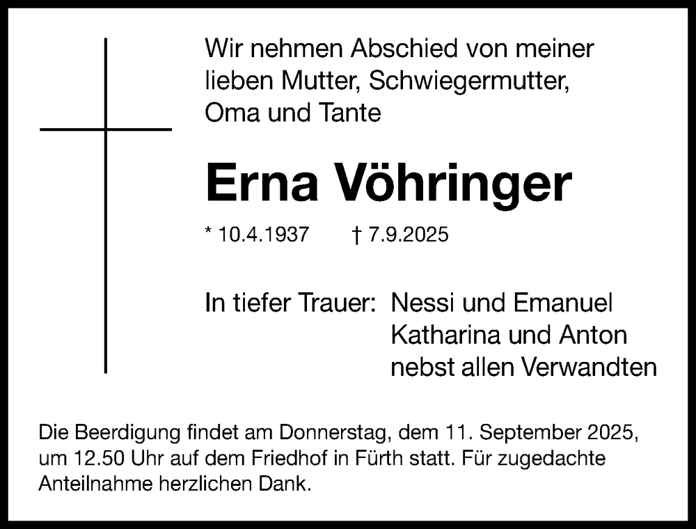 Hier finden Sie alle Traueranzeigen aus der Zeitung, die bisher für Erna Vöhringer erschienen sind. Weitere Traueranzeigen, die in der Zeitung erscheinen, werden hier ebenfalls aufgelistet