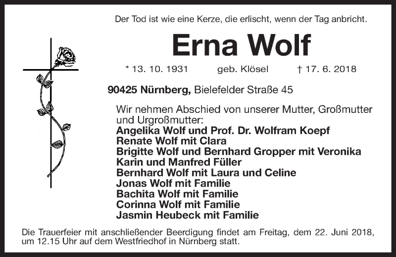 Hier finden Sie alle Traueranzeigen aus der Zeitung, die bisher für Erna Wolf erschienen sind. Weitere Traueranzeigen, die in der Zeitung erscheinen, werden hier ebenfalls aufgelistet