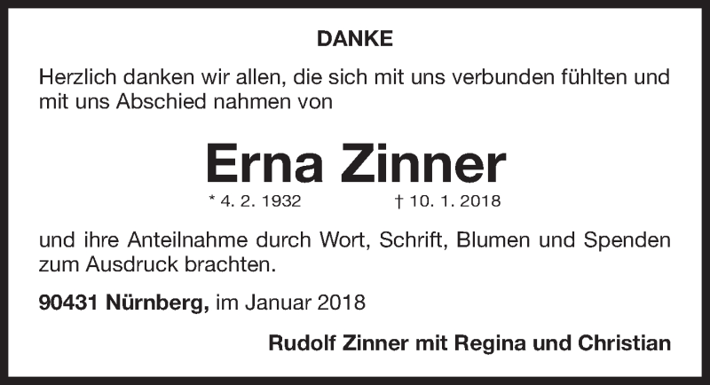 Hier finden Sie alle Traueranzeigen aus der Zeitung, die bisher für Erna Zinner erschienen sind. Weitere Traueranzeigen, die in der Zeitung erscheinen, werden hier ebenfalls aufgelistet