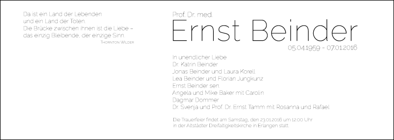 Hier finden Sie alle Traueranzeigen aus der Zeitung, die bisher für Ernst Beinder erschienen sind. Weitere Traueranzeigen, die in der Zeitung erscheinen, werden hier ebenfalls aufgelistet