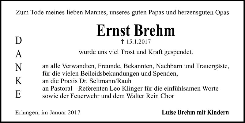 Hier finden Sie alle Traueranzeigen aus der Zeitung, die bisher für Ernst Brehm erschienen sind. Weitere Traueranzeigen, die in der Zeitung erscheinen, werden hier ebenfalls aufgelistet