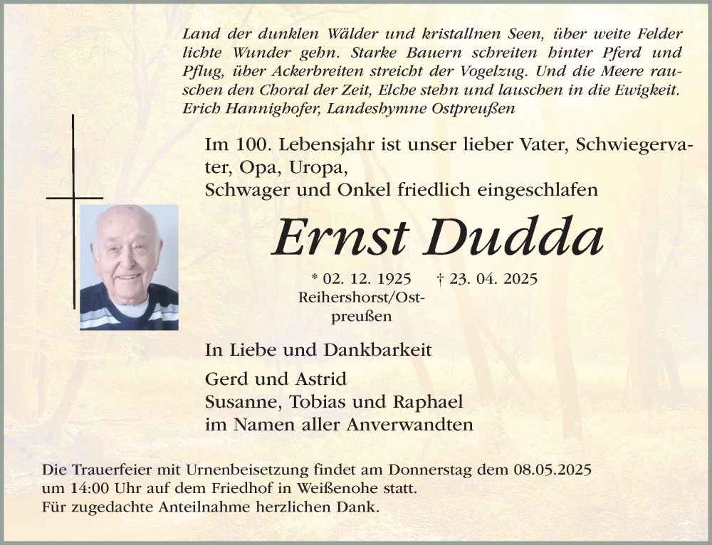 Hier finden Sie alle Traueranzeigen aus der Zeitung, die bisher für Ernst Dudda erschienen sind. Weitere Traueranzeigen, die in der Zeitung erscheinen, werden hier ebenfalls aufgelistet