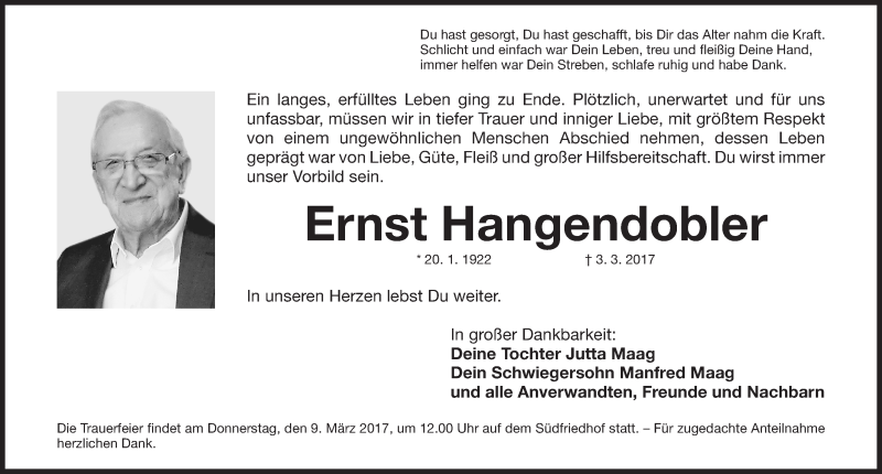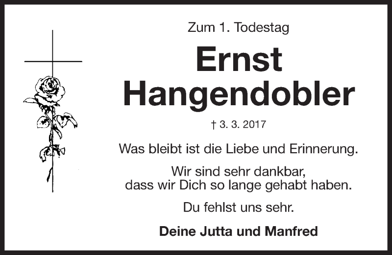 Hier finden Sie alle Traueranzeigen aus der Zeitung, die bisher für Ernst Hangendobler erschienen sind. Weitere Traueranzeigen, die in der Zeitung erscheinen, werden hier ebenfalls aufgelistet
