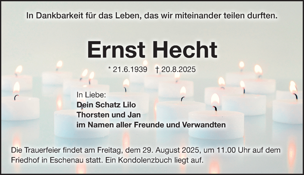 Hier finden Sie alle Traueranzeigen aus der Zeitung, die bisher für Ernst Hecht erschienen sind. Weitere Traueranzeigen, die in der Zeitung erscheinen, werden hier ebenfalls aufgelistet