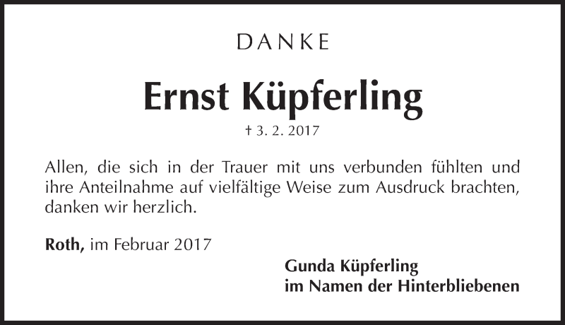 Hier finden Sie alle Traueranzeigen aus der Zeitung, die bisher für Ernst Küpferling erschienen sind. Weitere Traueranzeigen, die in der Zeitung erscheinen, werden hier ebenfalls aufgelistet
