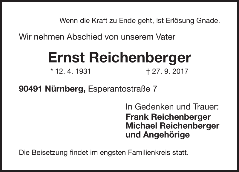 Hier finden Sie alle Traueranzeigen aus der Zeitung, die bisher für Ernst Reichenberger erschienen sind. Weitere Traueranzeigen, die in der Zeitung erscheinen, werden hier ebenfalls aufgelistet