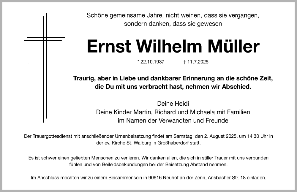 Hier finden Sie alle Traueranzeigen aus der Zeitung, die bisher für Ernst Wilhelm Müller erschienen sind. Weitere Traueranzeigen, die in der Zeitung erscheinen, werden hier ebenfalls aufgelistet