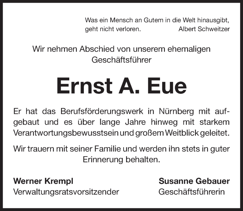 Hier finden Sie alle Traueranzeigen aus der Zeitung, die bisher für Ernst A. Eue erschienen sind. Weitere Traueranzeigen, die in der Zeitung erscheinen, werden hier ebenfalls aufgelistet