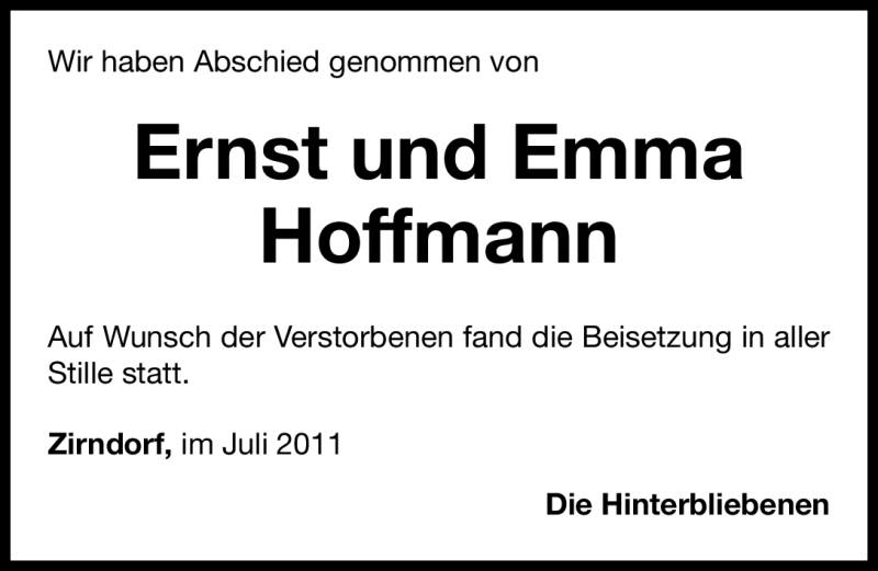 Hier finden Sie alle Traueranzeigen aus der Zeitung, die bisher für Ernst und Emma Hoffmann erschienen sind. Weitere Traueranzeigen, die in der Zeitung erscheinen, werden hier ebenfalls aufgelistet