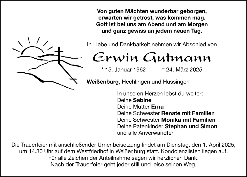 Hier finden Sie alle Traueranzeigen aus der Zeitung, die bisher für Erwin Gutmann erschienen sind. Weitere Traueranzeigen, die in der Zeitung erscheinen, werden hier ebenfalls aufgelistet