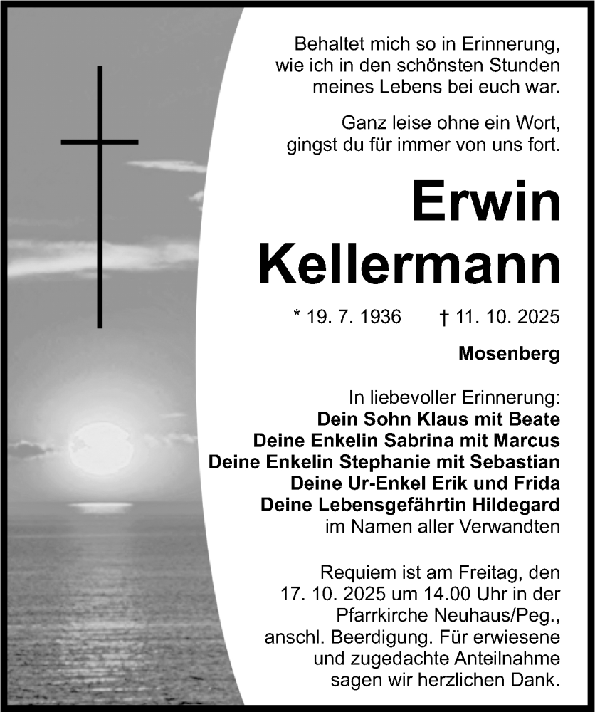 Hier finden Sie alle Traueranzeigen aus der Zeitung, die bisher für Erwin Kellermann erschienen sind. Weitere Traueranzeigen, die in der Zeitung erscheinen, werden hier ebenfalls aufgelistet