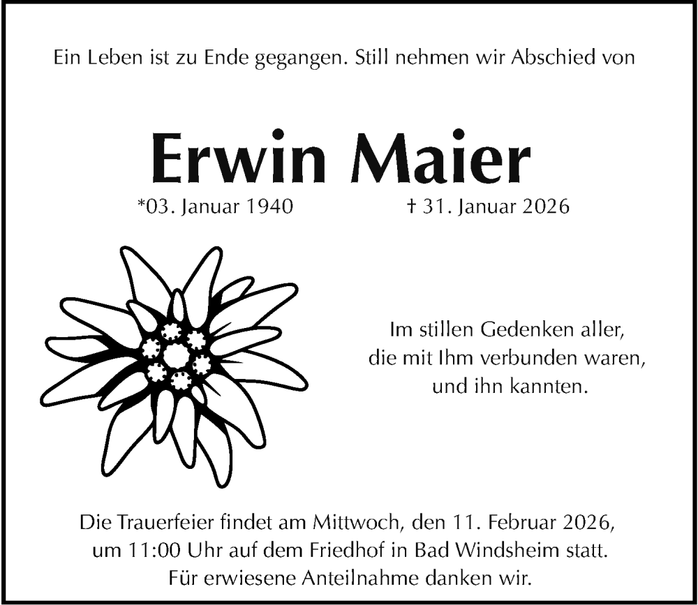 Hier finden Sie alle Traueranzeigen aus der Zeitung, die bisher für Erwin Maier erschienen sind. Weitere Traueranzeigen, die in der Zeitung erscheinen, werden hier ebenfalls aufgelistet