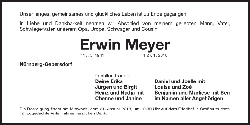 Hier finden Sie alle Traueranzeigen aus der Zeitung, die bisher für Erwin Meyer erschienen sind. Weitere Traueranzeigen, die in der Zeitung erscheinen, werden hier ebenfalls aufgelistet