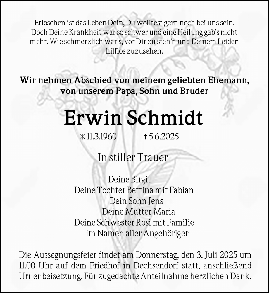 Hier finden Sie alle Traueranzeigen aus der Zeitung, die bisher für Erwin Schmidt erschienen sind. Weitere Traueranzeigen, die in der Zeitung erscheinen, werden hier ebenfalls aufgelistet