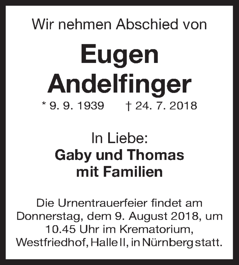Hier finden Sie alle Traueranzeigen aus der Zeitung, die bisher für Eugen Andelfinger erschienen sind. Weitere Traueranzeigen, die in der Zeitung erscheinen, werden hier ebenfalls aufgelistet