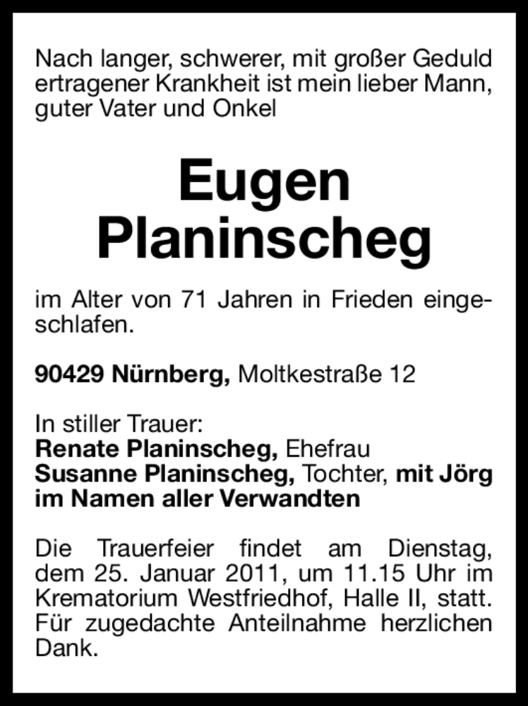 Hier finden Sie alle Traueranzeigen aus der Zeitung, die bisher für Eugen Planinscheg erschienen sind. Weitere Traueranzeigen, die in der Zeitung erscheinen, werden hier ebenfalls aufgelistet