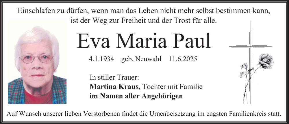 Hier finden Sie alle Traueranzeigen aus der Zeitung, die bisher für Eva Maria Paul erschienen sind. Weitere Traueranzeigen, die in der Zeitung erscheinen, werden hier ebenfalls aufgelistet