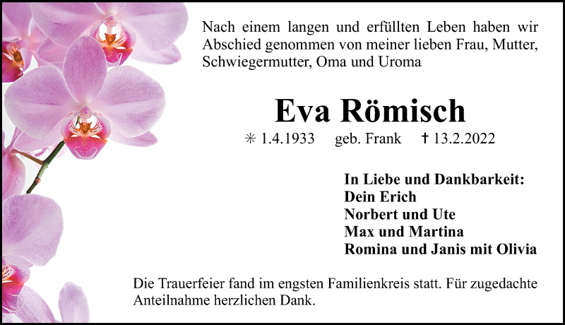 Hier finden Sie alle Traueranzeigen aus der Zeitung, die bisher für Eva Römisch erschienen sind. Weitere Traueranzeigen, die in der Zeitung erscheinen, werden hier ebenfalls aufgelistet