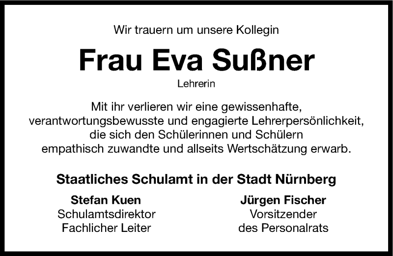 Hier finden Sie alle Traueranzeigen aus der Zeitung, die bisher für Eva Sußner erschienen sind. Weitere Traueranzeigen, die in der Zeitung erscheinen, werden hier ebenfalls aufgelistet