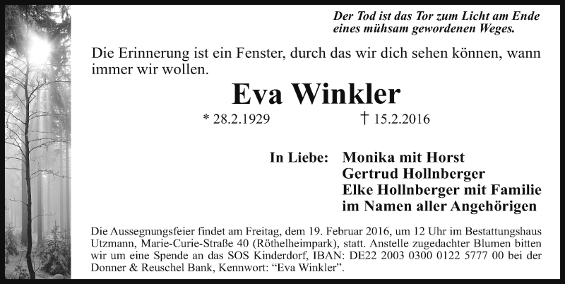 Hier finden Sie alle Traueranzeigen aus der Zeitung, die bisher für Eva Winkler erschienen sind. Weitere Traueranzeigen, die in der Zeitung erscheinen, werden hier ebenfalls aufgelistet