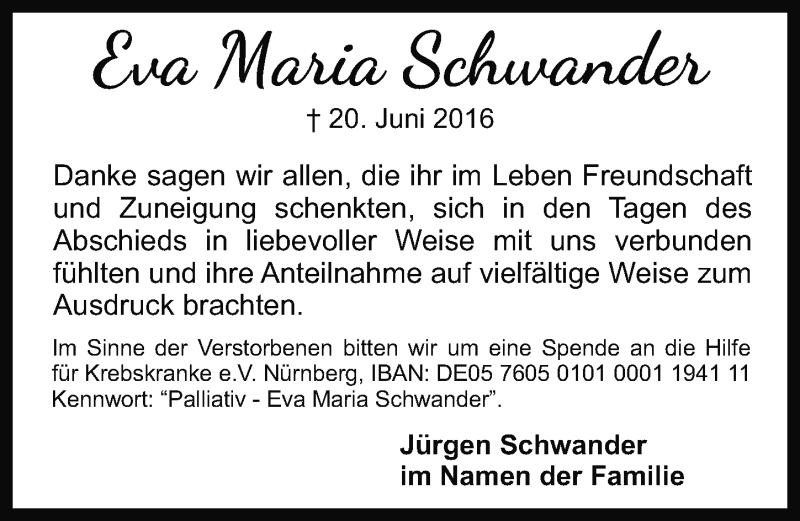 Hier finden Sie alle Traueranzeigen aus der Zeitung, die bisher für Eva Maria Schwander erschienen sind. Weitere Traueranzeigen, die in der Zeitung erscheinen, werden hier ebenfalls aufgelistet