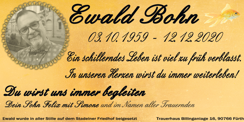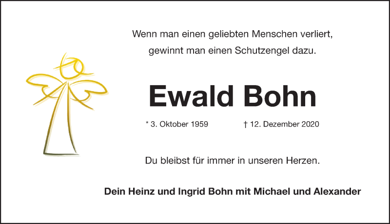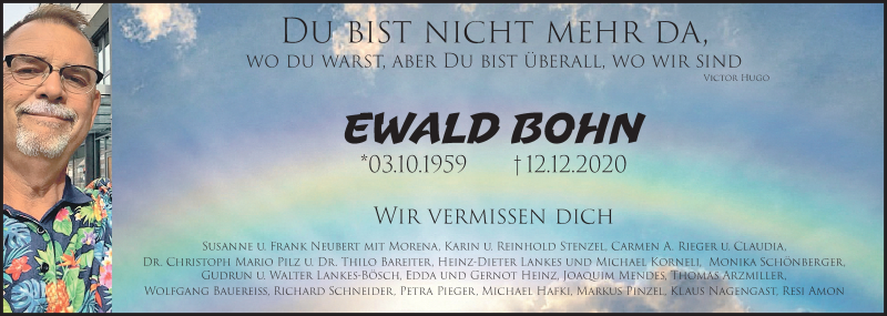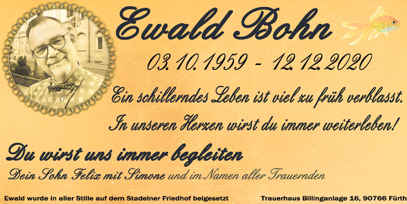 Hier finden Sie alle Traueranzeigen aus der Zeitung, die bisher für Ewald Bohn erschienen sind. Weitere Traueranzeigen, die in der Zeitung erscheinen, werden hier ebenfalls aufgelistet