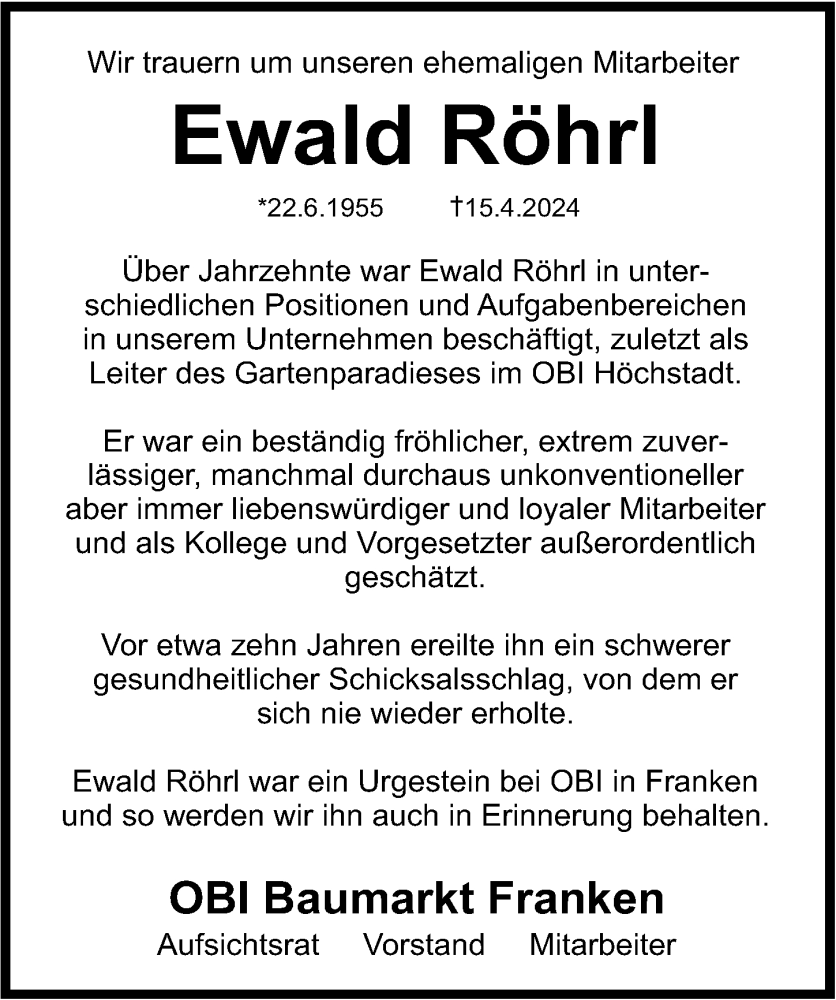 Hier finden Sie alle Traueranzeigen aus der Zeitung, die bisher für Ewald Röhrl erschienen sind. Weitere Traueranzeigen, die in der Zeitung erscheinen, werden hier ebenfalls aufgelistet