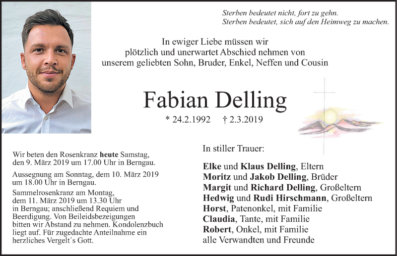 Hier finden Sie alle Traueranzeigen aus der Zeitung, die bisher für Fabian Delling erschienen sind. Weitere Traueranzeigen, die in der Zeitung erscheinen, werden hier ebenfalls aufgelistet