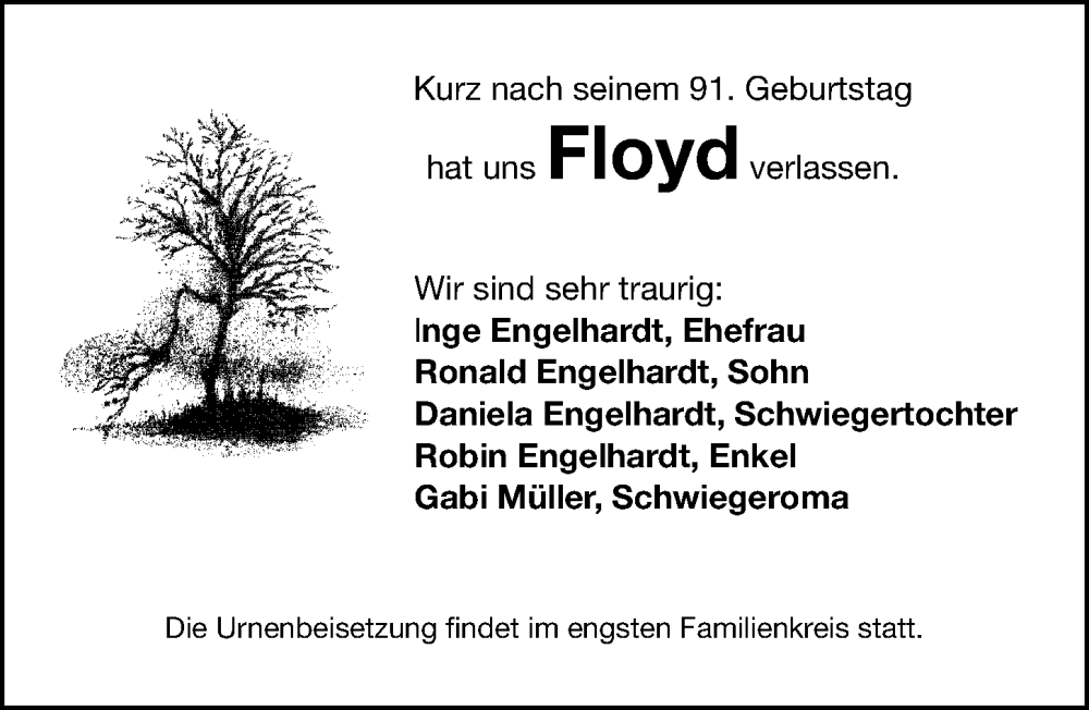 Hier finden Sie alle Traueranzeigen aus der Zeitung, die bisher für Floyd erschienen sind. Weitere Traueranzeigen, die in der Zeitung erscheinen, werden hier ebenfalls aufgelistet
