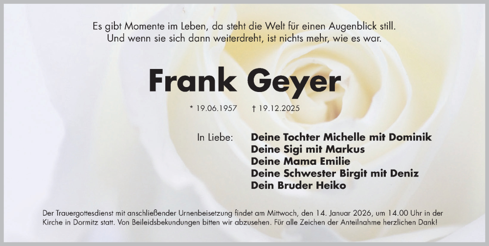 Hier finden Sie alle Traueranzeigen aus der Zeitung, die bisher für Frank Geyer erschienen sind. Weitere Traueranzeigen, die in der Zeitung erscheinen, werden hier ebenfalls aufgelistet