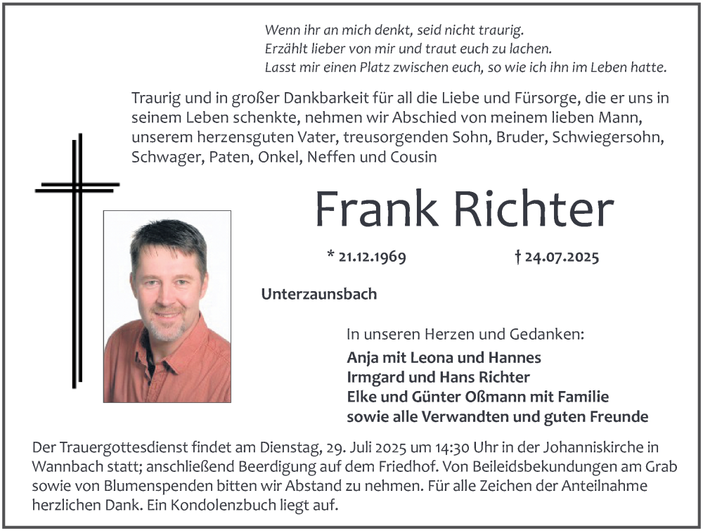 Hier finden Sie alle Traueranzeigen aus der Zeitung, die bisher für Frank Richter erschienen sind. Weitere Traueranzeigen, die in der Zeitung erscheinen, werden hier ebenfalls aufgelistet