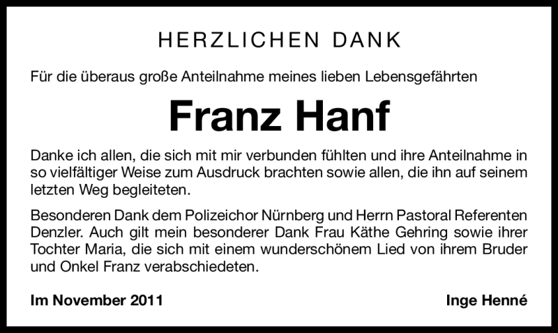 Hier finden Sie alle Traueranzeigen aus der Zeitung, die bisher für Franz Hanf erschienen sind. Weitere Traueranzeigen, die in der Zeitung erscheinen, werden hier ebenfalls aufgelistet