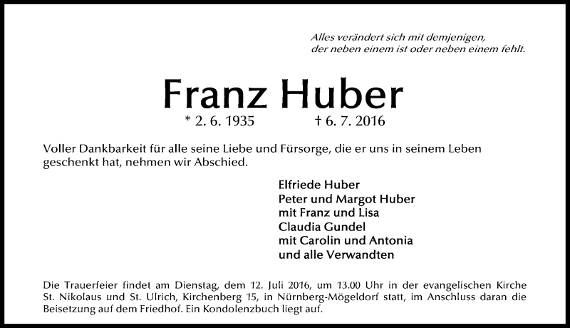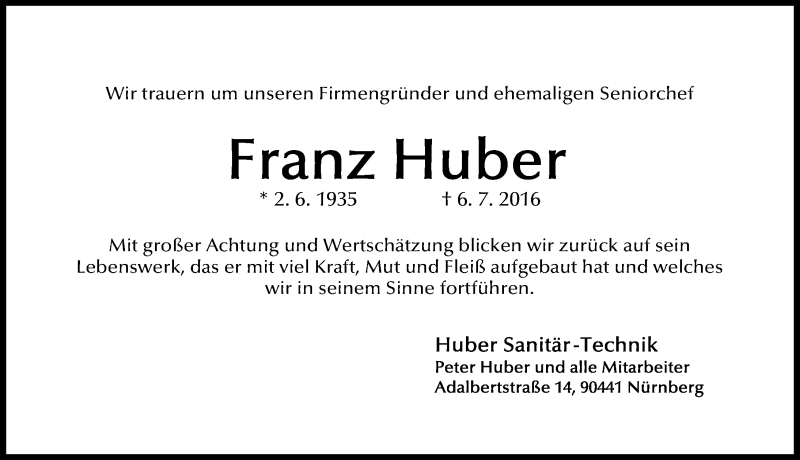 Hier finden Sie alle Traueranzeigen aus der Zeitung, die bisher für Franz Huber erschienen sind. Weitere Traueranzeigen, die in der Zeitung erscheinen, werden hier ebenfalls aufgelistet