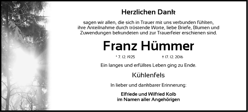 Hier finden Sie alle Traueranzeigen aus der Zeitung, die bisher für Franz Hümmer erschienen sind. Weitere Traueranzeigen, die in der Zeitung erscheinen, werden hier ebenfalls aufgelistet