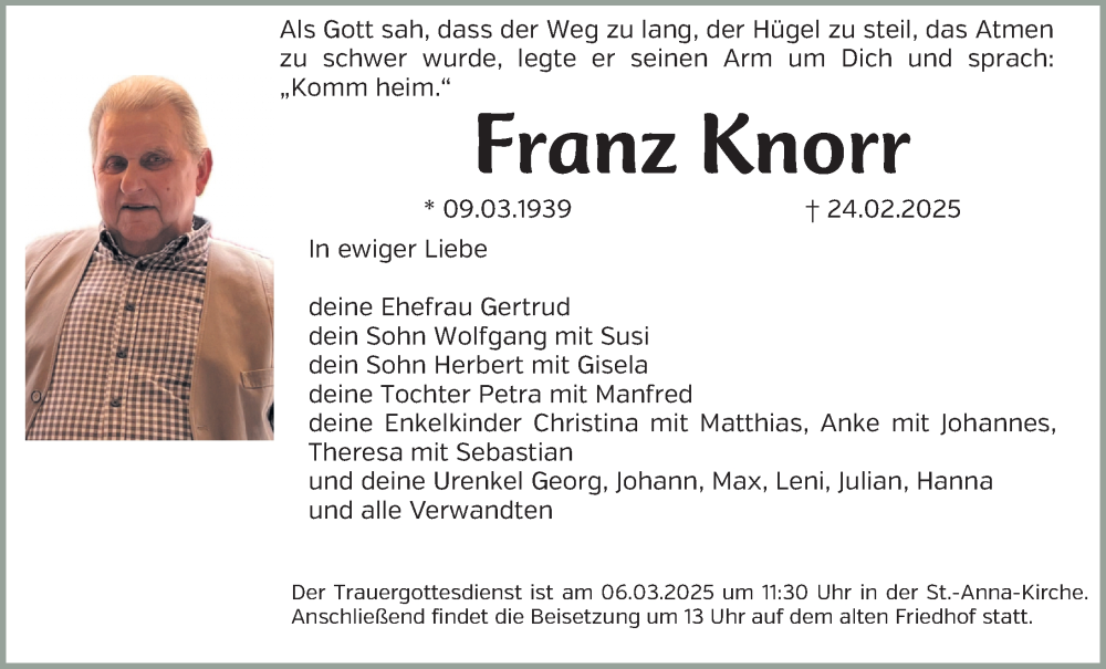 Hier finden Sie alle Traueranzeigen aus der Zeitung, die bisher für Franz Knorr erschienen sind. Weitere Traueranzeigen, die in der Zeitung erscheinen, werden hier ebenfalls aufgelistet