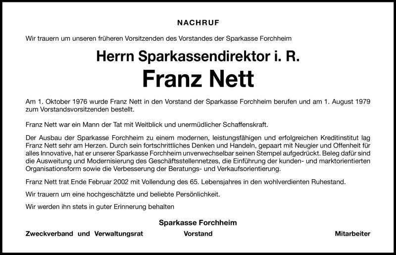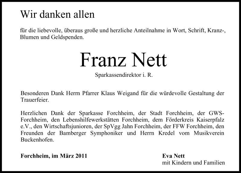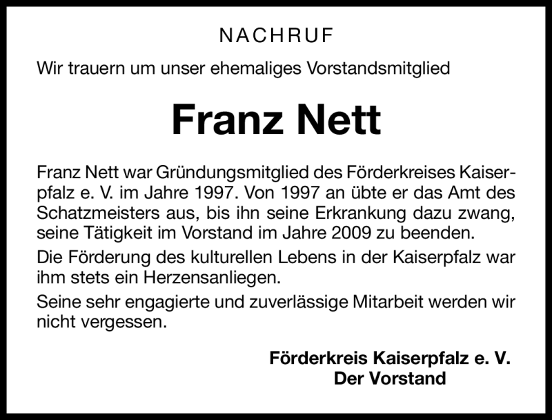 Hier finden Sie alle Traueranzeigen aus der Zeitung, die bisher für Franz Nett erschienen sind. Weitere Traueranzeigen, die in der Zeitung erscheinen, werden hier ebenfalls aufgelistet