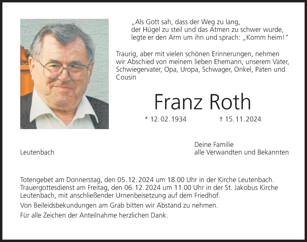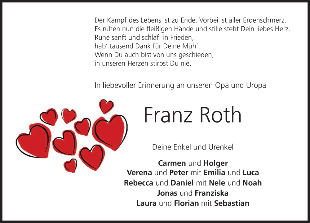 Hier finden Sie alle Traueranzeigen aus der Zeitung, die bisher für Franz Roth erschienen sind. Weitere Traueranzeigen, die in der Zeitung erscheinen, werden hier ebenfalls aufgelistet