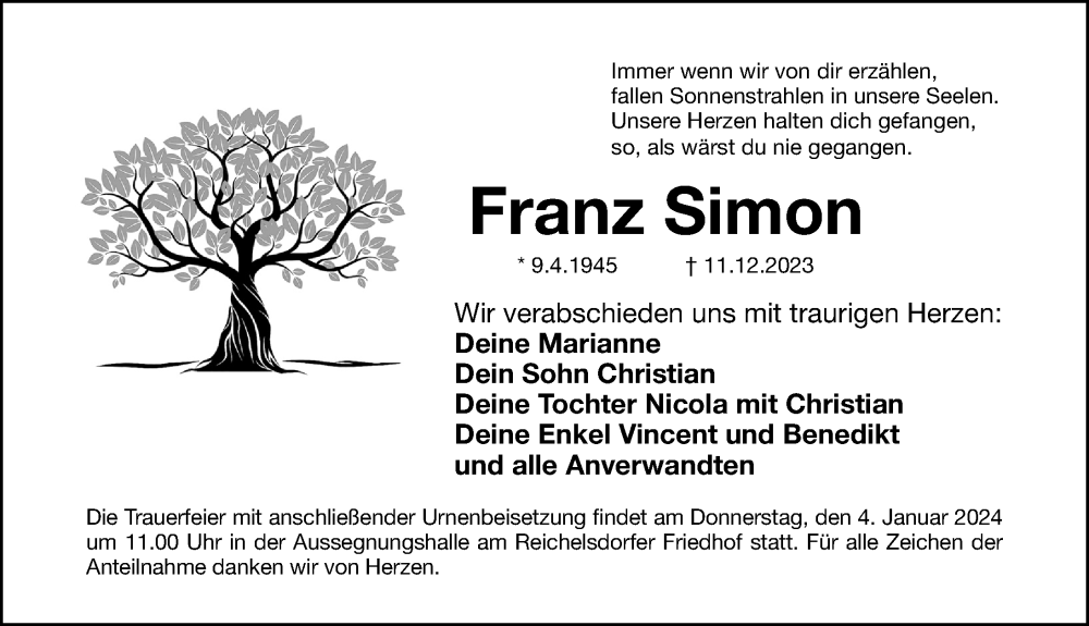 Hier finden Sie alle Traueranzeigen aus der Zeitung, die bisher für Franz Simon erschienen sind. Weitere Traueranzeigen, die in der Zeitung erscheinen, werden hier ebenfalls aufgelistet
