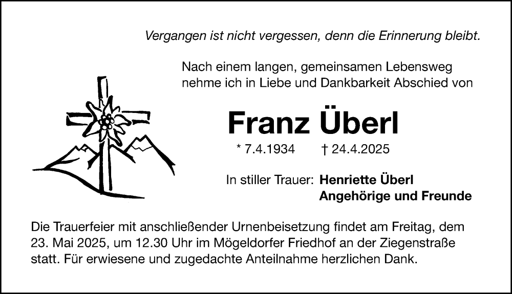 Hier finden Sie alle Traueranzeigen aus der Zeitung, die bisher für Franz Überl erschienen sind. Weitere Traueranzeigen, die in der Zeitung erscheinen, werden hier ebenfalls aufgelistet