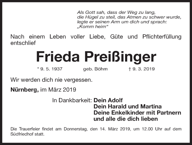 Hier finden Sie alle Traueranzeigen aus der Zeitung, die bisher für Frieda Preißinger erschienen sind. Weitere Traueranzeigen, die in der Zeitung erscheinen, werden hier ebenfalls aufgelistet