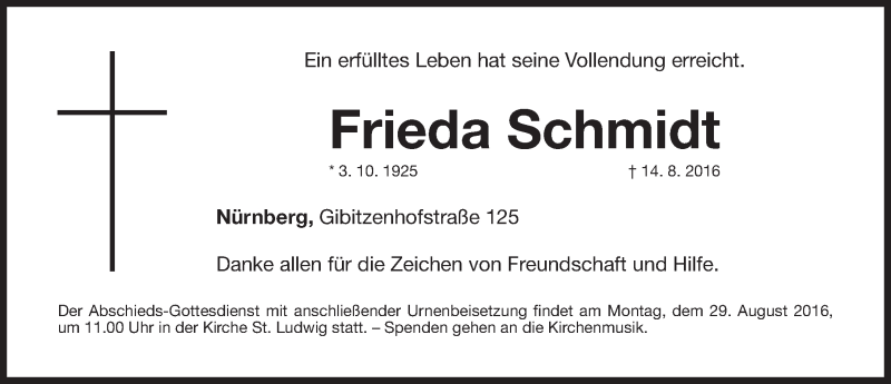 Hier finden Sie alle Traueranzeigen aus der Zeitung, die bisher für Frieda Schmidt erschienen sind. Weitere Traueranzeigen, die in der Zeitung erscheinen, werden hier ebenfalls aufgelistet