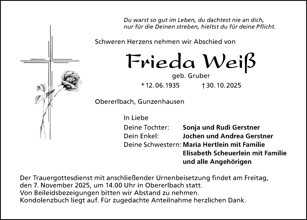Hier finden Sie alle Traueranzeigen aus der Zeitung, die bisher für Frieda Weiß erschienen sind. Weitere Traueranzeigen, die in der Zeitung erscheinen, werden hier ebenfalls aufgelistet
