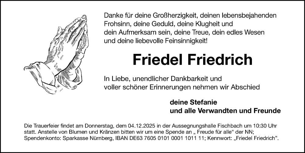 Hier finden Sie alle Traueranzeigen aus der Zeitung, die bisher für Friedel Friedrich erschienen sind. Weitere Traueranzeigen, die in der Zeitung erscheinen, werden hier ebenfalls aufgelistet